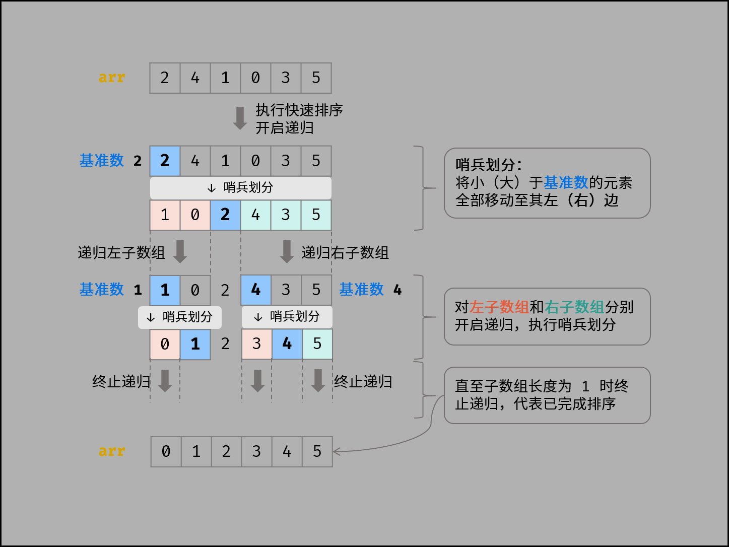 - 递归:继续对左子数组和右子数组执行哨兵划分,直到子数组的长度为1时终止