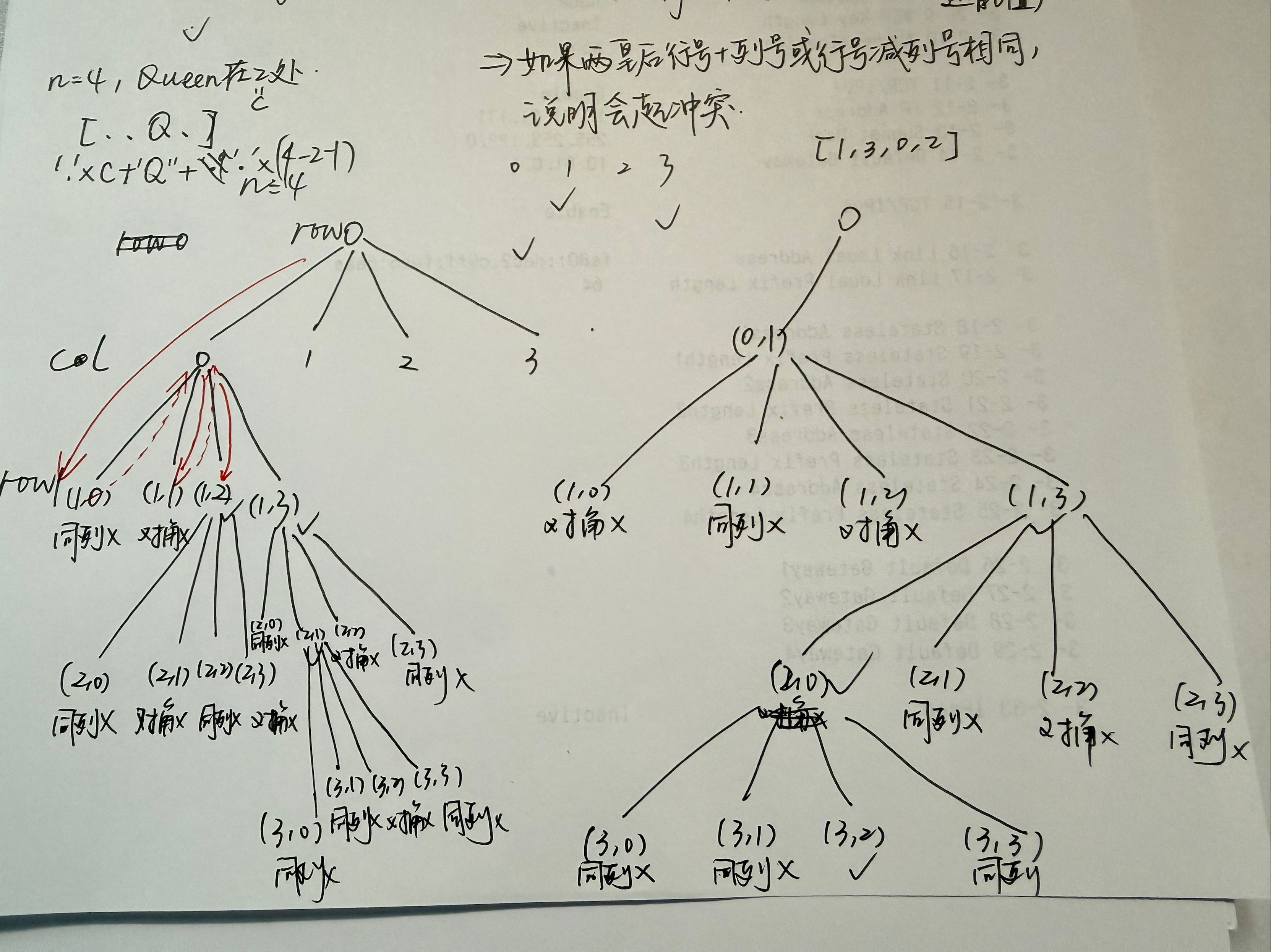 也就意味着,比如当前在$[2, 3]$位置处放了queen,那么对于其他任意满足$i+j=2+3 =5$以及$i-j=-1$的位置都不能再放queen了。于是乎,我们可以定义两个对角元素的考察列表ldiag和rdiag,因为n是固定的,有$0\leq i + j\leq n-1+n-1=2n-2$,$0-(n-1)=-n+1\leq i-j\leq n-1$,那么两个考察列表的长度分别为$2n-2+1=2n-1$以及$n-1-(-n+1)+1=2n-1$,是相同的,这样一来就能把所有可能的情况涵盖进去(这里尽管$i - j$可能会是负数,但是我们只要定义了足够长的列表,当索引为负值时,从逆向取值,也是能够满足我们的要求的,我们在这里只是要判断某个$i - j$是否已经被占用了),如果在某个位置$[i, j]$放了queen,那么就分别将ldiag$[i + j]$以及rdiag$[i - j]$的位置设置为True即可,这两个变量也是需要回溯的